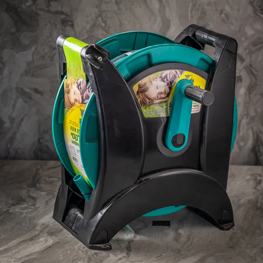 גלגלת השקייה עומדת על הריצפה עם אקדח ואביזרים