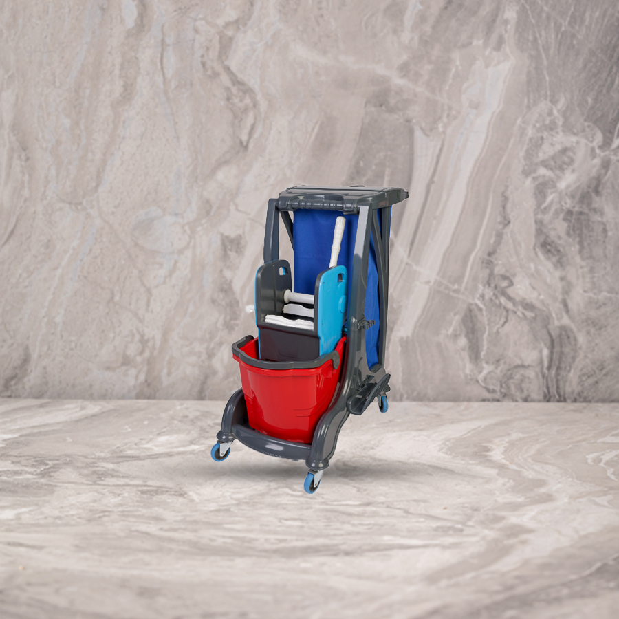 עגלה מקצועית לניקיון כוללת מסחטה, פח אשפה ודלי למילוי מים