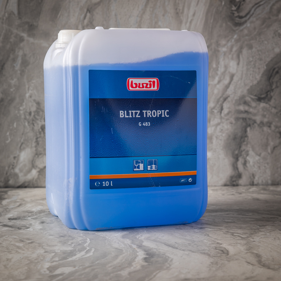 10 ליטר בוזיל תוצרת גרמניה נוזל מקצועי מרוכז במיוחד בניחוח טרופי לניקוי והברקת מרצפות, שולחנות, ורהיטים על בסיס אלכוהול. מתאים לכל המשטחים העמידים במים.